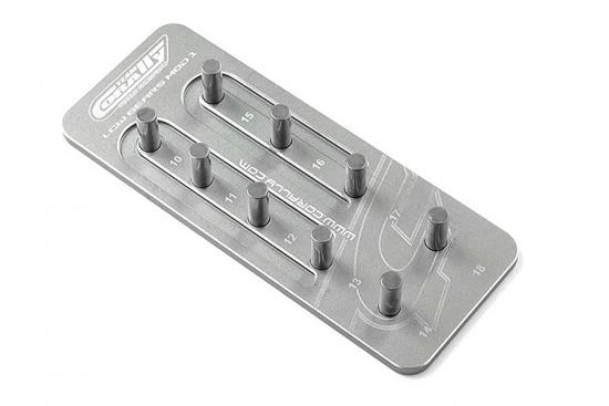 The Team Corally Pinion Caddy is what you need in your toolbox to keep track of your car gearing. Made in hich quality CNC machined aluminium with posts to hold 9 pieces of MOD 1 pinions with 5mm shaft. Fine laser engraved with TC logo and pinion teeth numbering.